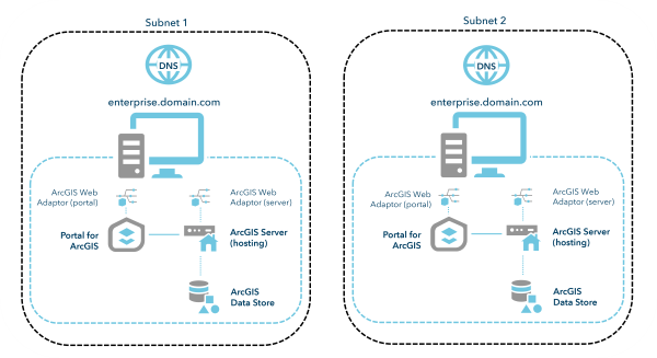 Alternatively, you can configure the standby environment DNS to resolve the FQDN of the public URLs differently depending on if you're on the primary machines or the standby machines. This is commonly referred to as a split DNS or split-horizon DNS. An additional Web Adaptor, reverse proxy, or load balancer is required for this method, as the public URL has to be accessible to federate the portal and server site.